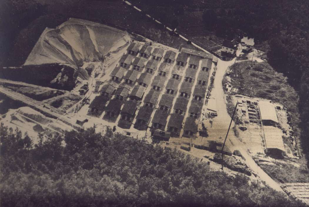 Historische Luftausnahme des Kreidebruches Buddenhagen. Sehr gut sind die Strukturen des historischen Kreideabbaus - Kreideabbau im Trichter-Schlitzschurren-Verfahren, Rührwerke, Absetzbecken, Trockenschuppen - zu erkennen.