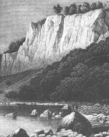 Gleich hinter Sassenitz beginnt das Ufer kreidig zu werden und nimmt die wunderbarsten Gestalten an, je weiter man kommt. Die Kreidewände streben senkrecht empor aus einer schrägen, bald nackten, bald mit Gehölz bedeckten Lehne und werden, hier steigend, dort fallend, von schmalen Einschnitten und tiefen Klüften unterbrochen, welche gelben, mit Erdstreifen vermischten Ton enthalten. Der obere Rand ist mit stolzen Buchen eingefaßt, und die Schichtenrichtung des ganzen aufgeflözten Gebirgslagers läuft fast überall horizontal. Das Bergufer ist auf das mannigfaltigste gezackt, geborsten und durchrissen, und die Imagination hat ein freies Spiel, sich diese Wundergestalten als Obelisken, Säulen, Tempel, Ruinen und Festungsbasteien vorzustellen.