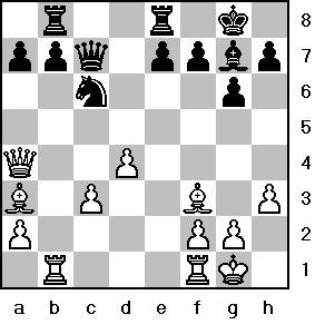 1. e4 c5 2. c3 Gegen den Taktiker wird eine ruhige Variante gewählt - dies zeitigt schnellen Erfolg. 2....Nf6 3. e5 Nd5 4. d4 cxd4 5. Nf3 Nc6 6. cxd4 d6 7.exd6 Qxd6 8. Nc3 Bg4 9. Be2 g6 ? Die falsche Aufstellung, wie sich bald zeigt. 10. h3 Bxf3 11. Bxf3 Nxc3 12. bxc3 Weiß hat einen soliden Positionsvorteil. Bg7 13. O-O O-O 14. Qb3 Qc7 15. Ba3 Rfe8 16. Rab1 Rab8 17. Qa4